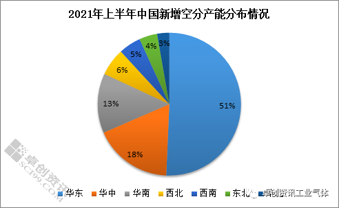 受下游相关行业的带动,中国空分产能持续增长。据卓创资讯数据监测,截至2021年6月底,中国空分装置产能达到3200万Nm3/h,较2020年底增加110万Nm3/h。上半年新增空分产能主要集中在华东、华中以及华南地区,华东主要集中在钢铁及石化两大行业,占比达到51%,位居第一。华中新增产能集中在煤化工及钢铁行业,占比18%,排名第二。华南主要以配套钢铁为主,占比13%。西部地区煤化工、钢铁、锂电池均有。东北主要以钢铁为主,华北新增产能较少。