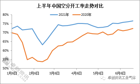据卓创数据监测,2021年上半年中国空分开工率较2020年上半年增长8.22个百分点。今年上半年空分开工率增幅明显,主要得益于钢铁市场,从3月份开始,受钢铁升温刺激,空分开工负荷持续上升,尽管5月份受假期影响企业常规检修增多,空分开工率略降,但进入6月份,空分开工率升至75.91%。
