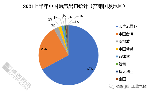 从产销国及地区来看,上半年氩气出口至印尼的量最大,为2.57万吨,占比总出口量67%,同比增加110%,较2019年同期增加16.2%,据卓创资讯了解,主要是盈德、恒力石化等从辽宁地区出口较多;出口至中国台湾地区的量为9511吨,占比总出口量约25%,排在第二位;出口至新加坡978.8吨,占比3%。此外,对中国香港、菲律宾、缅甸、澳大利亚、泰国其他地区亦有部分出口。