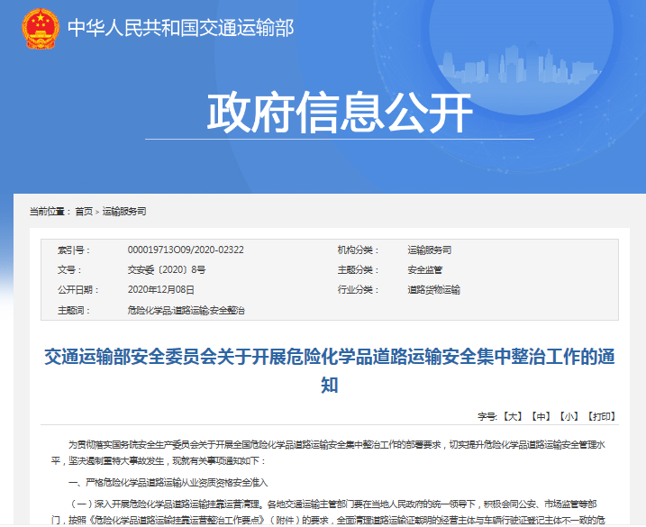 为了提升危化品运输安全管理水平,去年12月,交通运输部发布了《关于开展危险化学品道路运输安全集中整治工作的通知》,其中明确提出,危化品运输要在2021年底前全面消除挂靠经营。