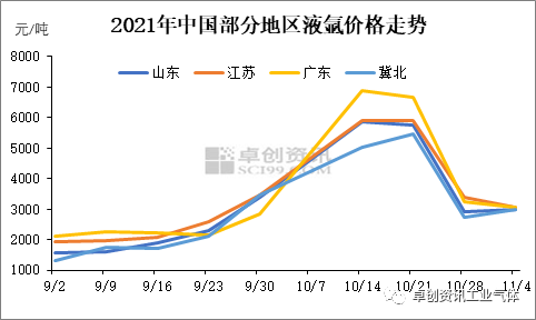 根据价格走势图来看,9至10月液氩市场价格冲高回落,最高点近5800元/吨,至10月底降至3400元/吨左右,较高点下降41%,多地价格腰斩。虽然进入11月东北等地高价仍在回落,但采暖季即将开启叠加即将到来的冬奥会,京津冀地区钢厂陆续降负,液氩供应再度收紧,支撑价格低位反弹。此外,华东、华南等地库存压力有所缓解,考虑到长三角等地部分空分开工依然不高,及河北资源南下减少,山东等地亦有所上涨,液氩市场迎来转折。