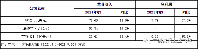 [导语] 2021年三季度三大外资工业气体公司均延续上半年的增长态势,整体业绩表现良好,均实现同比正增长。