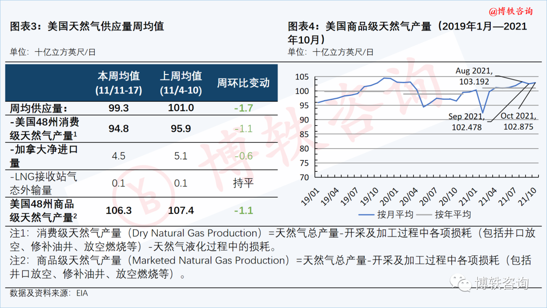 本周(11月11日-17日),美国本土周均供应量降至993亿立方英尺/日。其中,美国48州消费级天然气产量降至948亿立方英尺/日,加拿大管道气净进口量降至45亿立方英尺/日。