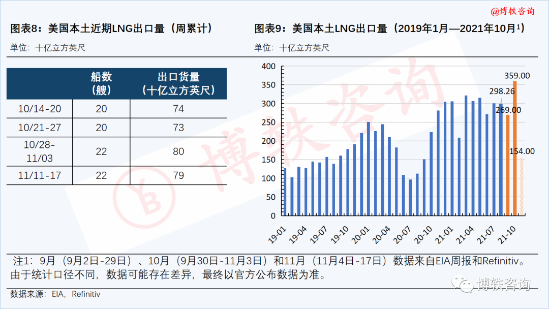 近期,美国本土LNG出口量保持在历史高位区间。11月11日-17日,共有22艘船货出港,出口货量为790亿立方英尺。