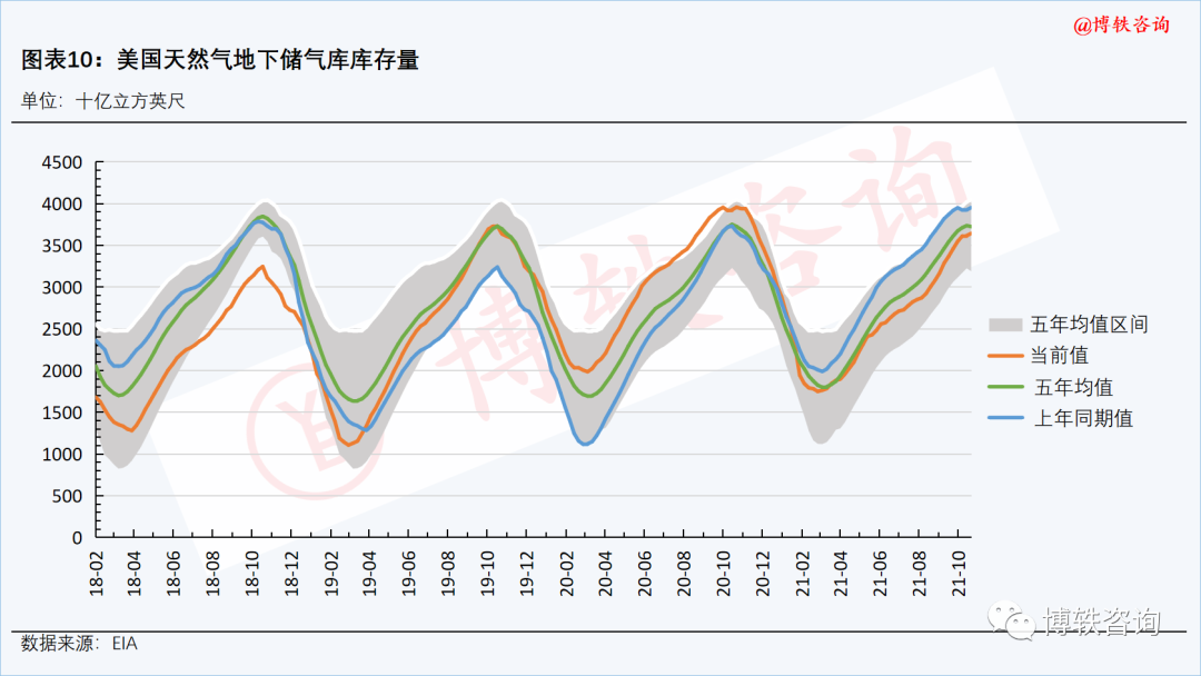 库存方面,截至11月12日,美国天然气地下储气库库存量升至36440亿立方英尺,比去年同期水平低3100亿立方英尺,比5年均值(2016-2020年)低810亿立方英尺。
