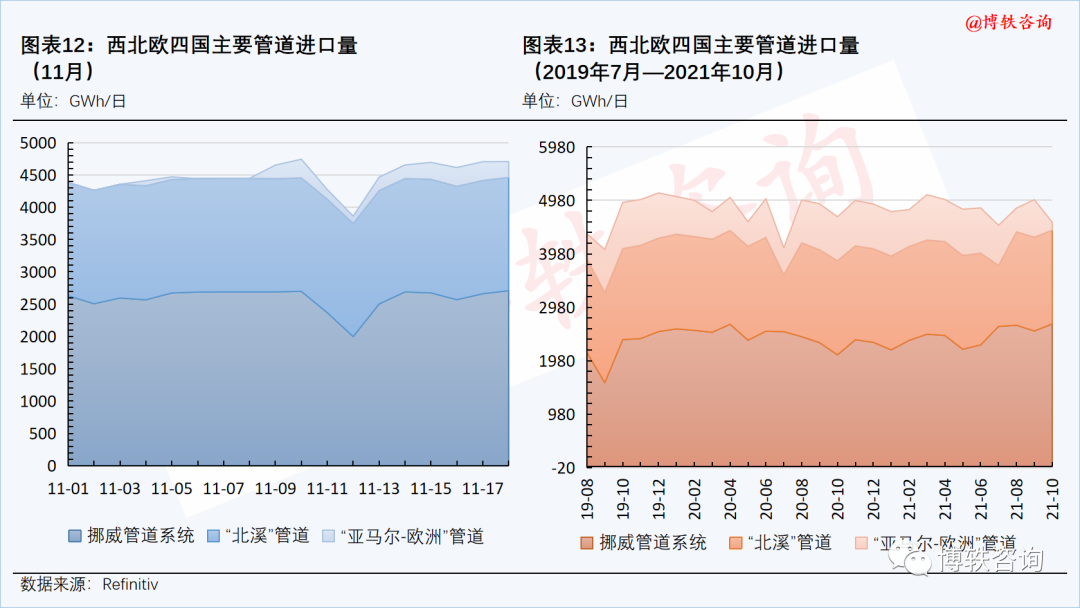 管道气方面,本周四(11月18日),西北欧四国管道气整体流入量为4706GWh/日,周环比(11月12日)上升21.82%。