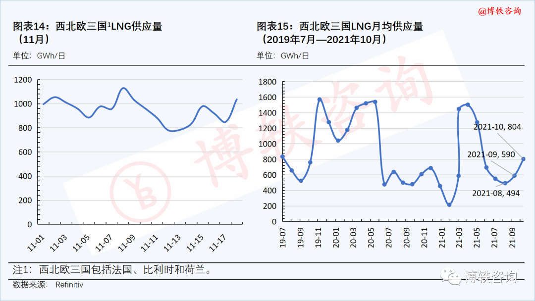 LNG供应量提升。本周四(11月18日),西北欧三国的LNG供应量为1036GWh/日,周环比(11月12日)上升258GWh/日。