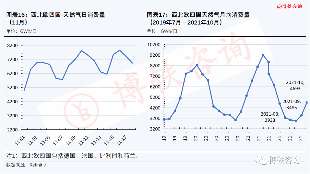 本周,西北欧四国天然气消费量保持在高位。本周四(11月18日),消费量为6932Wh/日,周环比(11月12日)下降173Wh/日。