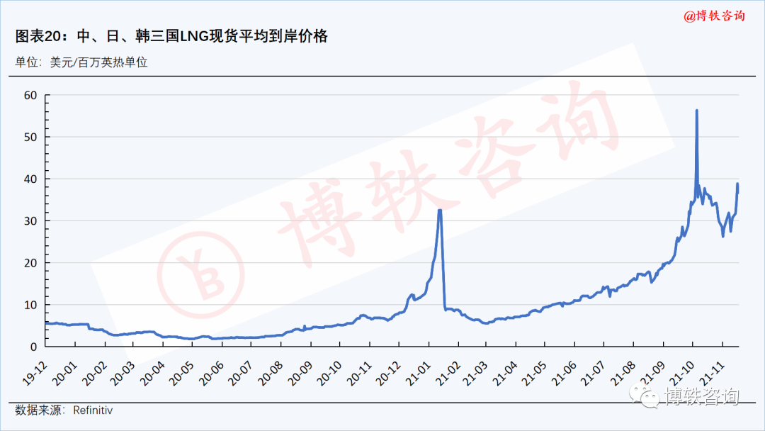 路透社提供的信息显示,本周(11月15日-19日),东北亚地区LNG现货到岸价格(2022年1月交割)为36.7美元/百万英热单位,周环比(11月8日-12日)上升5.2美元/百万英热单位,涨幅为16.5%。
