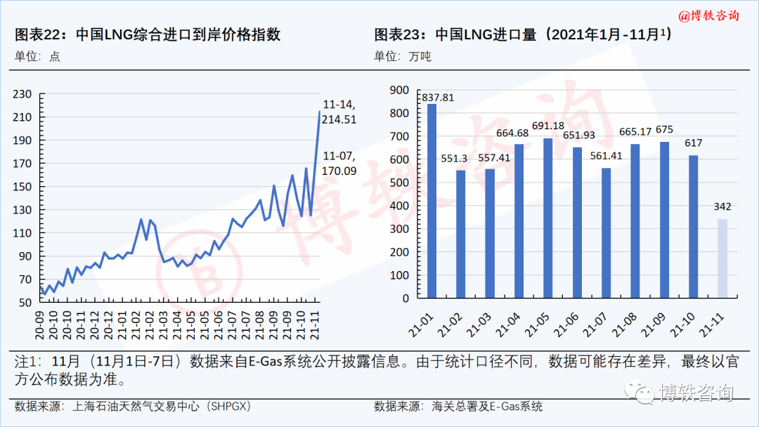 11月8日-14日,中国LNG综合进口到岸价格指数为214.51(C.I.F,不含税费、加工费),周环比(11月1日-7日)上升26.12%,同比上涨161.28%。