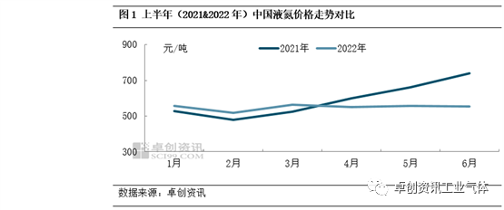 通过图1可以看出,2021年与2022年上半年中国液氮价格走势差异明显,2021年呈现“先抑后扬”的态势,2022年则显现“先抑后扬再震荡”。据卓创资讯数据监测,2022年上半年中国液氮均价为549.87元/吨,比2021年上半年跌6.51%。