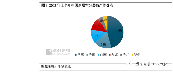 受下游相关配套行业发展的带动,中国空分产能持续增长。据卓创资讯数据监测,2022年上半年中国空分装置新增产能76万Nm3/h,其新增产能多为钢铁、化工等行业自配空分。新增空分产能主要集中在华东以及华南地区,两者占比64%。西南、西北新增产能占比分别在14%、13%,主要以配套钢铁、煤化工为主,另外,全液化空分产能也继续增多。华北、华中新增产能较少,占比在4%-5%,上半年东北无新增产能。