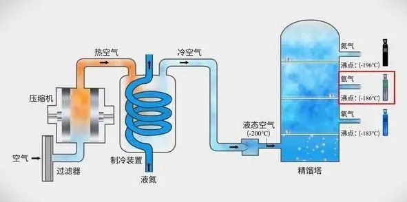 说起来道理很简单,用冷凝器可以先把沸点为90.2 K 的氧液化,然后继续冷却就可以液化沸点为87.3K(也就是-185.85℃)的氩气,最后留下沸点77.35K的氮气。空气中最主要的就是这三种组分,几乎一次性就可以全部分离出来。