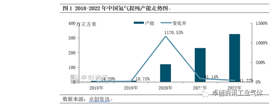 从图中可以看到,2018年、2019年中国投产的氦气项目较少。随着技术的革新以及下游需求的不断刺激,2020年中国氦气产能达到120.7万立方米,实现了同比1170.53%的增幅,创下历史新高。2021-2022年产能继续扩张,据卓创资讯数据监测,截至2022年底中国提氦产能达到325.8万立方米(582吨),较2021年增长41.22%。