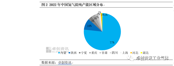 按区域来看,中国提氦产能主要分布在天然气资源较为丰富的内蒙古及陕西地区。其中内蒙古产能最多,占比达到77%,排名第一,2022年新增产能有内蒙古正泰易达。其次是陕西省,占比10%,排名第二,2022年新增产能是榆林圆恒能源以及陕西延长集团。宁夏、重庆产能占比均在3%,重庆新增产能是中石化重庆石油分公司项目。甘肃占比达到2%,其提氦产能是庆阳瑞华项目。上海、河北、湖北占比均在1%,主要是空气分离法提氦。整体来看,2022年新增产能主要集中在内蒙古、陕西、重庆以及甘肃地区。
