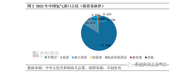 2022年中国氦气进口主要来源地为卡塔尔、美国、澳大利亚、阿联酋、欧洲其他国家以及新加坡等。据卓创资讯统计,2022年自卡塔尔地区进口氦气3354.82吨,较去年同期增加9.37%,占比83.66%;自美国进口425.323吨,占比10.61%,较去年同期增加22.91%;自澳大利亚进口158.988吨,占比3.96%,较去年同期减少47.8%;自阿联酋、欧洲其他国家以及新加坡进口较少。由此可见,2022年自卡塔尔、美国进口量增加,澳大利亚进口量减少。