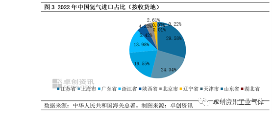 2022年中国进口氦气地区主要为江苏省,其占比29.58%,依托经济强省及地理位置,进口量排名第一,进口企业主要为空气化工、林德、梅塞尔、液空等企业;其次是上海,进口占比达到24.34%;广东进口量排名第三,占比19.55%。另外,浙江、陕西、北京、辽宁、天津、山东、湖北均有进口氦气。