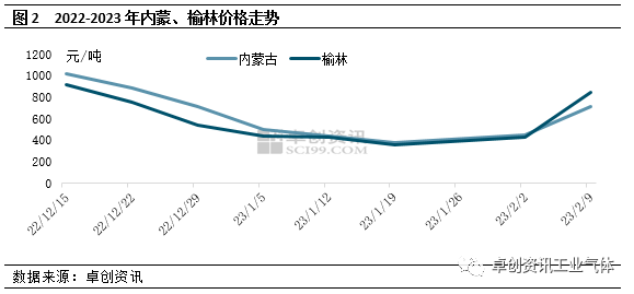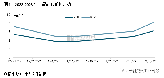 2022年底因硅料新增产能持续释放,市场供应过剩逐渐显现,价格自高位跌落,导致下游硅片采购谨慎,叠加硅片企业库存充裕,开工下降。但随着硅片企业库存得以消化,企业春节开工预期提升叠加电池等终端需求提振,硅料采购增加,硅料价格迎来止跌反弹。在成本及下游需求共同推动下,硅片价格亦明显拉涨。根据图1可以看出,进入2023年国内单晶硅片价格开始走高,至2月10日,M10成交均价已涨至6.22元/片,较年初低点上调66%;G12成交价涨至8.2元/片,较年初低点上调67%。在价格提升、利润修复下,主力企业积极调高开工负荷,根据卓创资讯了解,目前青海、内蒙、宁夏等西北地区硅片企业均保持较高开工,且在青海、四川等部分新增产能释放下,周边市场液氩需求表现良好,助推节后液氩市场价格自低位反弹。
