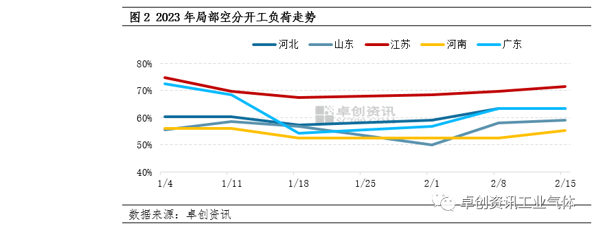 进入2月,尤其是元宵节后,随着下游相关行业进一步复工复产,空分开工负荷率整体微增,且高于去年同期水平。但另一方面,广东、广西以及长三角等地亦有新增空分装置检修,以及配套行业自用量增加、外销量减少等现象,当地供应减少下支撑本地液氮价格上涨。据卓创资讯数据监测,截至2月15日,中国空分开工负荷率在63.76%,同比上升1.02个百分点。需求面,节后东北、华北市场起色不大,其余市场均有回暖。另外,河南局部化工企业、新疆地区多晶硅企业均有采购,对局部液氮价格产生支撑。