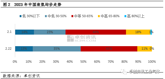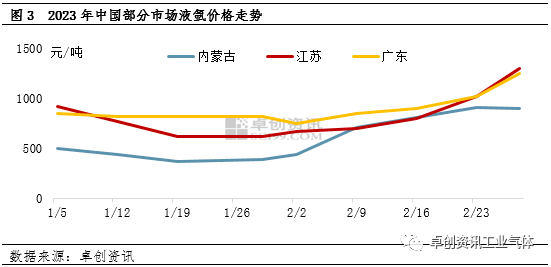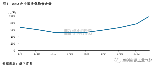 通过图1可以看出,随着春节假期结束,尤其是正月初十以后,液氩市场升温明显,价格持续上涨,根据卓创资讯数据监测,截至目前,全国液氩均价为974元/吨,较年内低价上涨84.4%。