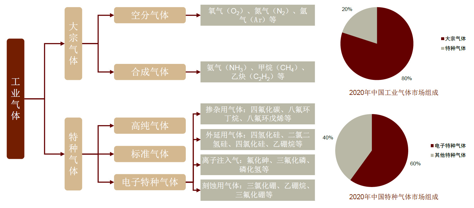 工业气体是现代工业重要的基础原料,因其种类范围广泛、应用于众多基础领域,被称为“工业的血液”,对国民经济的发展具有战略性和先导性的作用。按照纯度、应用领域的不同,工业气体可以分为大宗气体和特种气体。
