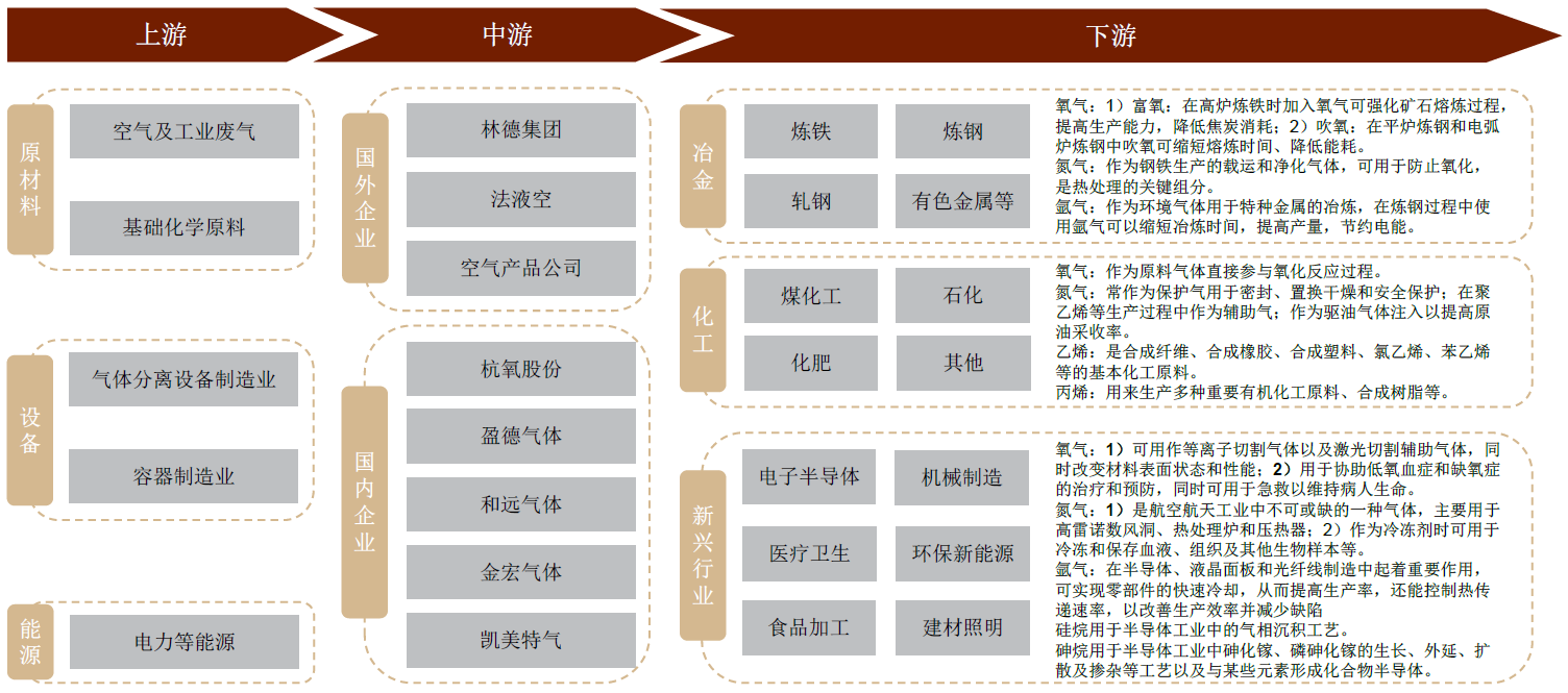工业气体上游行业核心为空气分离设备,下游应用广泛。工业气体上游领域为气体分离及纯化设备制造业、基础化学原料行业和压力容器设备制造业等,下游领域包括钢铁、冶金、化工等传统行业以及新能源、半导体、电子信息、生物医药、新材料等新兴行业。