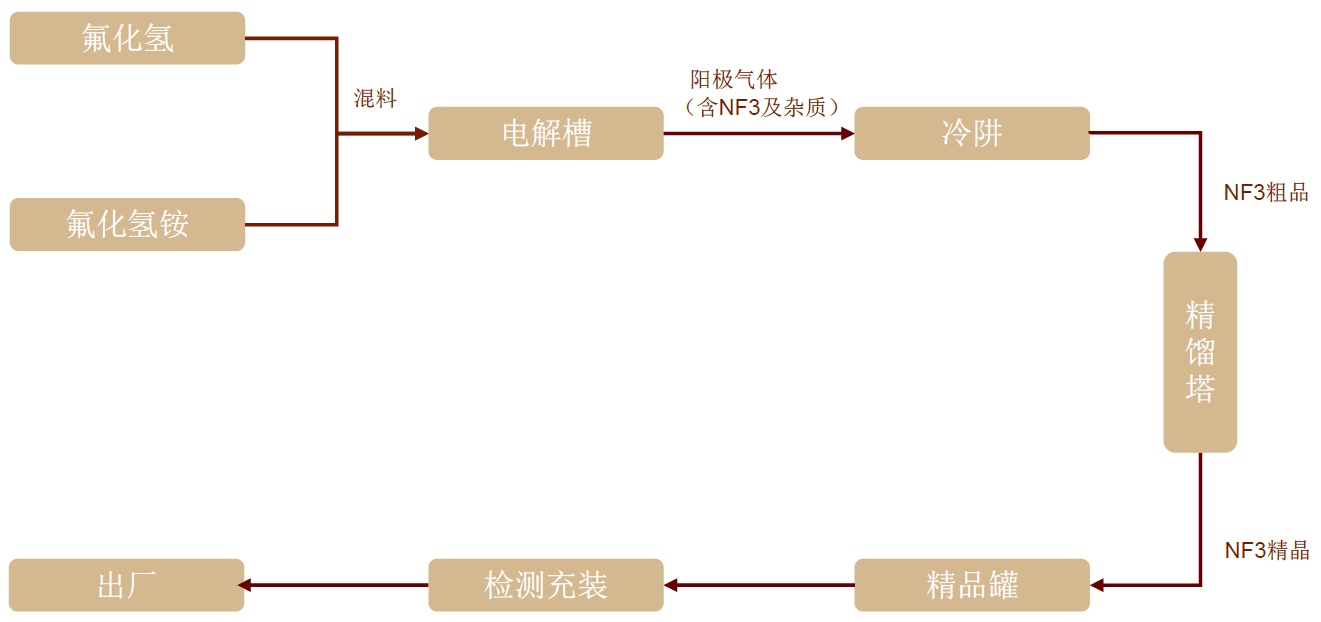 特种气体种类繁多,不同气体合成方法各异。以国内较早实现突破的三氟化氮为例,三氟化氮是常用于微电子工业中的一种等离子蚀刻气体,是大规模集成电路和显示面板等的清洗、刻蚀过程中常用的材料,七一八所成功研发出纯度高达99.9%的三氟化氮气体,突破了此领域国外的技术垄断。根据中船特气公司数据,三氟化氮工艺流程包括:首先将氟化氢、氟化氢铵等混合形成熔融状态的电解液,再用电解槽进行电解,主产品三氟化氮进入冷阱。通过精馏除去杂质,精馏后的产品由精品罐收集检测,最后进行充装。