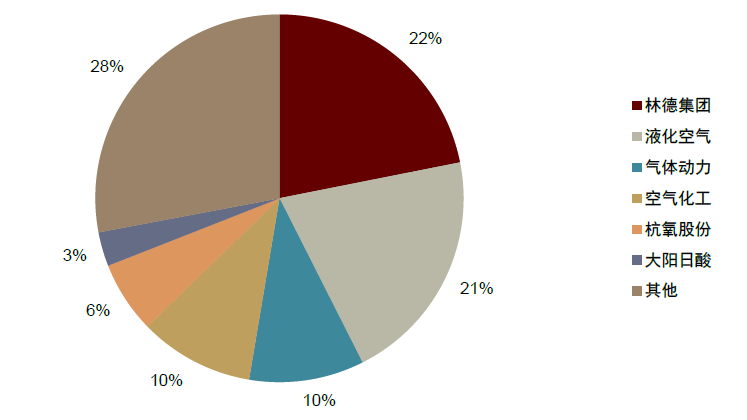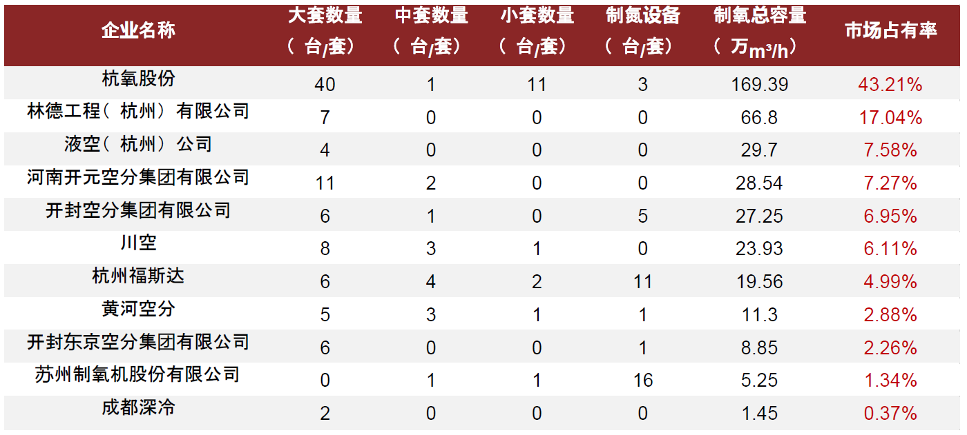 注:上表市场占有率的计算中氮气容量按0.5系数折算为氧容量。大型空分指6000Nm3/h及以上,中型空分为1000-6000Nm3/h之间,小型空分为1000Nm3/h以下。