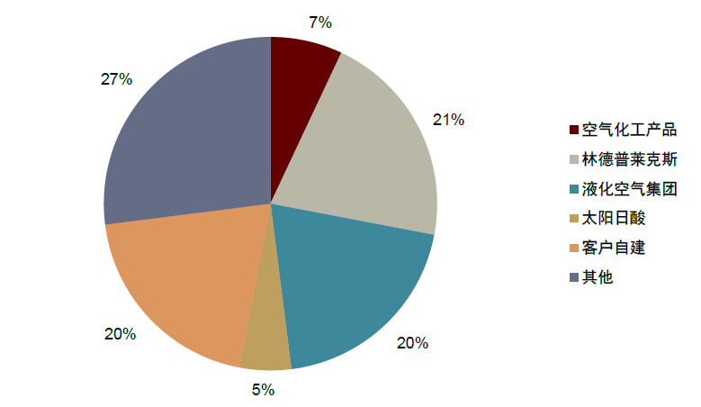 ► 现场制气市场格局:现场制气项目合同周期较长,根据杭氧股份公告,一般会与客户签订15-20年长期供气协议;目前市场集中度较高,国外龙头液化空气集团、林德集团、空气化工占比较高。
