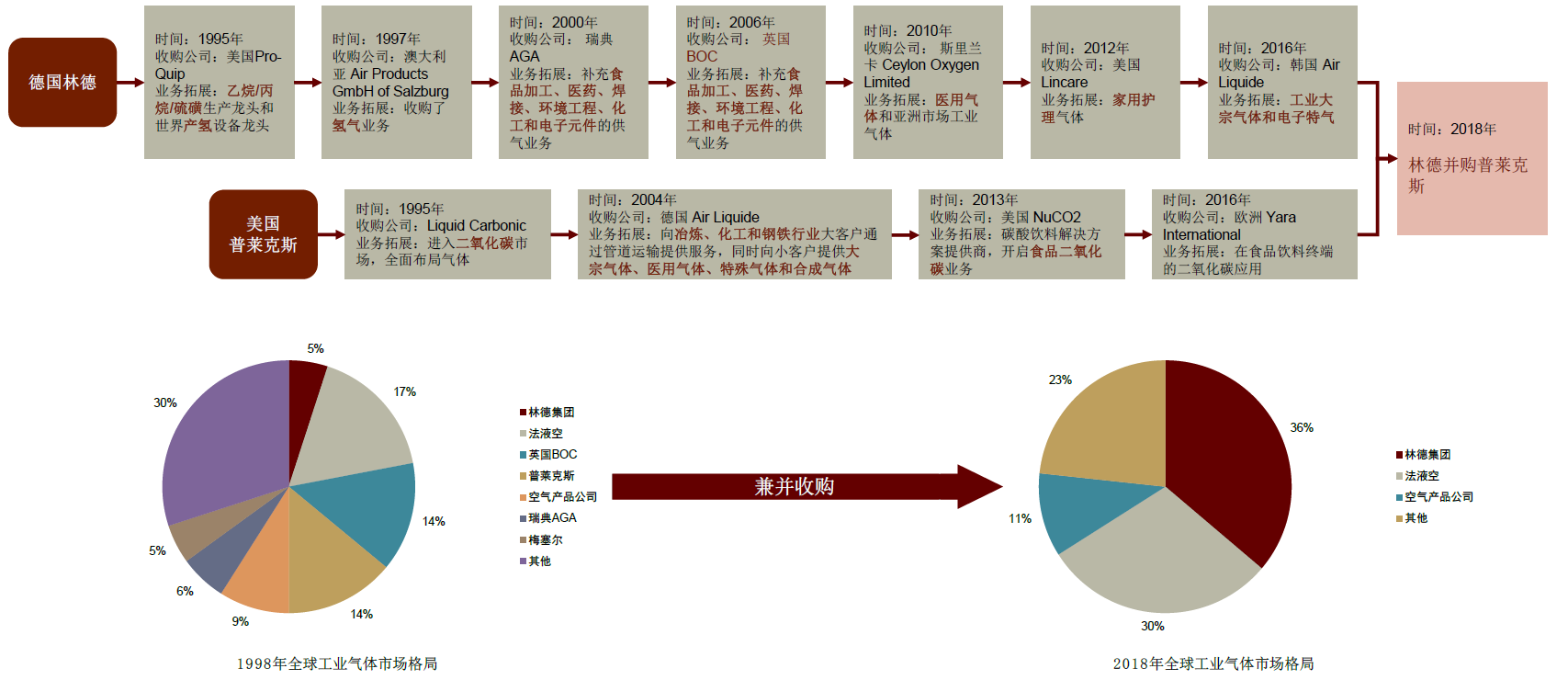 ► 1995年至今:全球技术高速进步,对新气体业务布局主要由收购拓展。2000年,林德与瑞典AGA合并,成为全球第四大、欧洲第二大气体供应商。2010年林德收购斯里兰卡医用气体和工业气体市场的领导者Ceylon Oxygen Limited95%的股份,这一收购帮助集团进入亚洲市场。2012年林德于4月收购了空气化工在比利时、法国、葡萄牙、西班牙的部分业务、8月收购美国公司Lincare,成为北美最大的家庭护理气体供应商。2018年,林德集团完成对普莱克斯的并购,再次完善工业气体业务布局,超越所有竞争对手成为全球工业气体龙头。