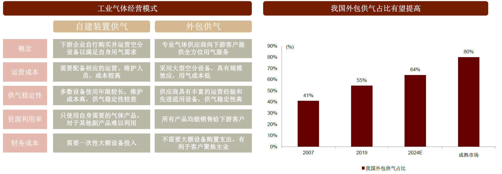 工业气体的供应模式可以分为自建装置供气和外包供气两种,外包供气运营成本低、供气稳定性高、资源利用效率高,我们认为未来外包供气的占比有望提高。根据侨源气体招股书,我国外包供气比例从2007年的41%提高至2019年的54.6%,杭氧股份可转债说明书中预计到2024年外包占比将逐步提高到64%,但较其预计的发达国家成熟市场80%的外包比例仍有较大提升空间。