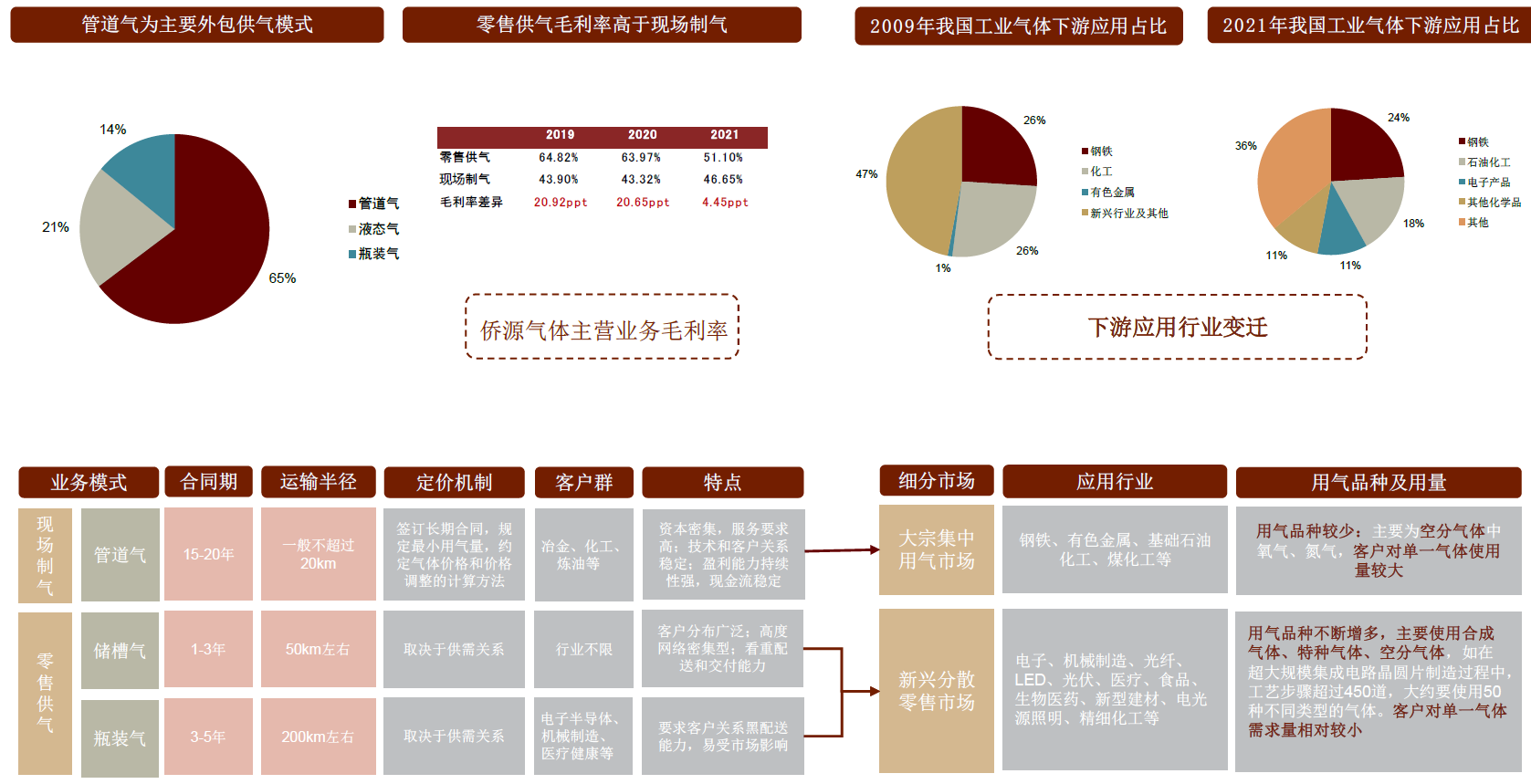 按供气方式的不同,外包供气可以分为现场制气和零售供气两种模式,分别对应下游大宗供气市场和新兴零售市场两大细分市场,零售供气随新兴零售市场的快速崛起而不断壮大。新兴零售市场符合产业结构变化趋势,根据中国产业网数据,占比从2009年的48%升至2021年的58%。现阶段虽然传统大宗用气市场仍占据较大份额,但其市场规模较为稳定,用气品类也较为单一。受益于我国新兴行业的快速发展,新兴零售用气市场不断壮大,用气数量和用气种类也不断提高。