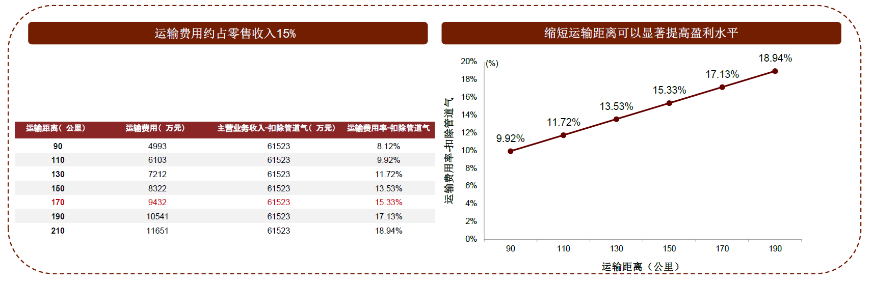 ► 核心假设:1)根据侨源气体招股书,2021年公司平均运输距离为160-180公里,我们假设为170公里;2)根据侨源气体招股书,2021年其运输费用为9432万元,约占其零售供气收入的15.33%;3)我们假设运输费用与运输距离为线性关系。