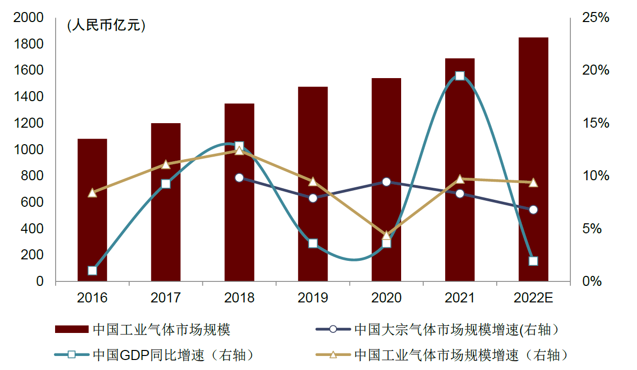 大宗气体市场规模随GDP增长持续扩容:根据亿渡数据,大宗气体作为工业气体的主体,占工业气体体量的80%,由于大宗气体的数据相对匮乏,我们将中国工业气体及大宗气体市场规模增速和中国GDP增速作比较,可以得到工业气体增速与GDP增速基本在同一增长区间,工业气体市场规模增速相对稳定,我们预计大宗气体将会继续稳定发展。