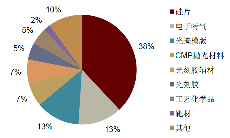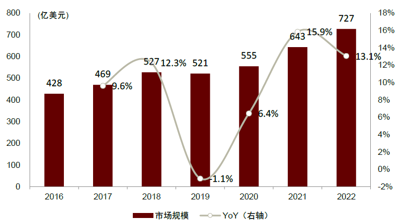 根据亿渡数据资料,特种气体种类众多,其中电子特气占比高达60%,新兴行业发展带动特气持续增长。半导体为电子气体的主要应用领域,根据国际半导体产业协会(SEMI)数据,2016-2018年全球半导体材料市场规模逐年增长,2019年市场规模下降至521.4亿美元,同比下降1.1%。随着半导体需求持续增长,2020-2022年全球半导体材料市场规模快速上升,2022年达到727亿美元,同比增长8.9%。在半导体生产材料成本结构中,硅片材料占比为38%,电子特气占比为13%,是除硅片材料以外的第二重要半导体材料。往前看,半导体行业正处于成长期,随着通信、汽车电子、人工智能等新兴终端市场飞速发展,半导体行业的成长或将推动电子气体需求不断增长。