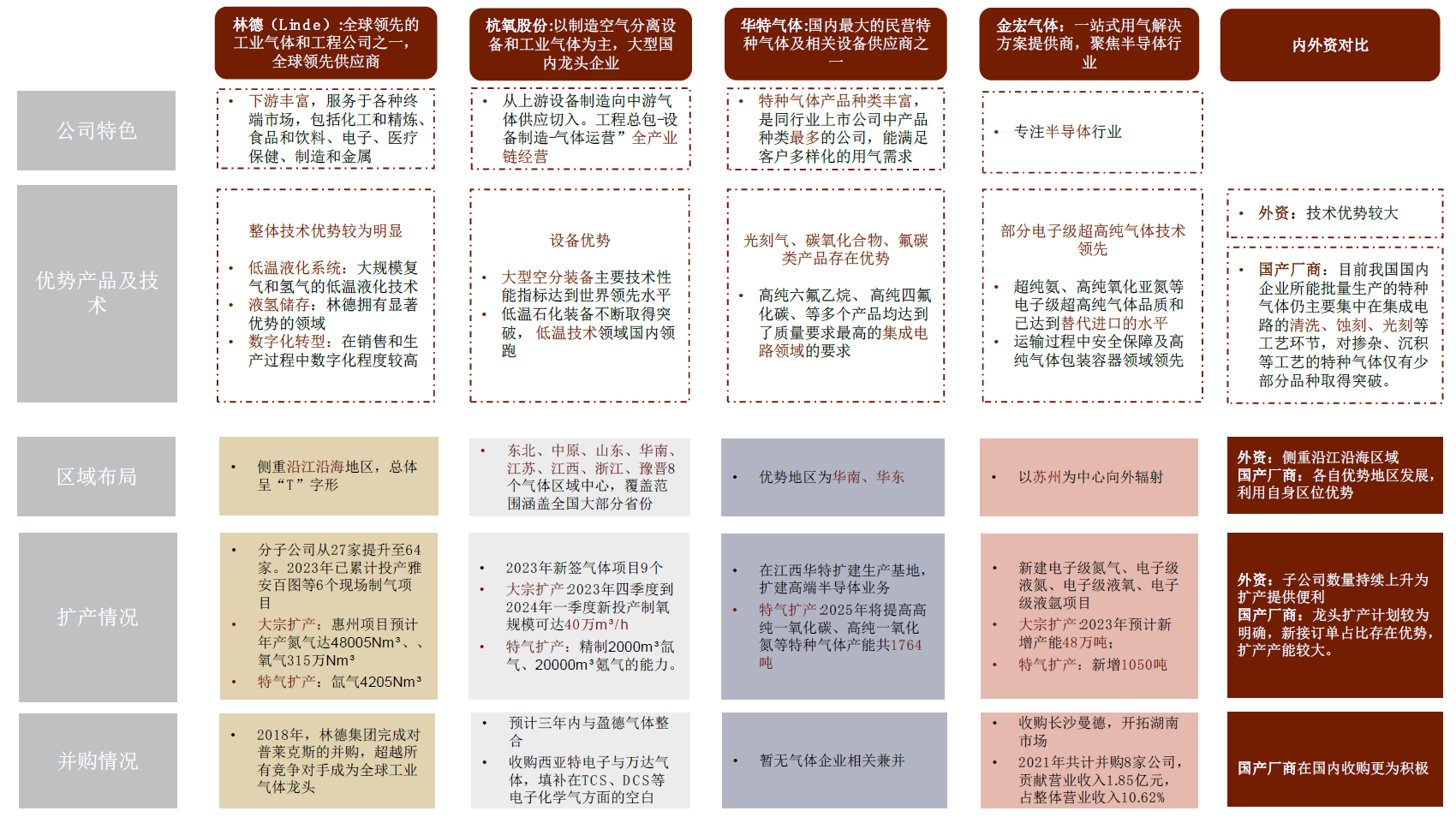 在本节中,我们通过对比国际巨头和国内工业气体供应商在技术、产品、产能、区域布局、兼并购等要素,试图找寻国内工业气体供应商持续追赶国际巨头的合理路径:凭借更灵活的服务响应机制,持续在外资薄弱的环节和地区进行区域布局和并购整合,扩充产品线、顺应下游需求适时扩产,才能有望进一步提升市占率逐步实现进口替代。