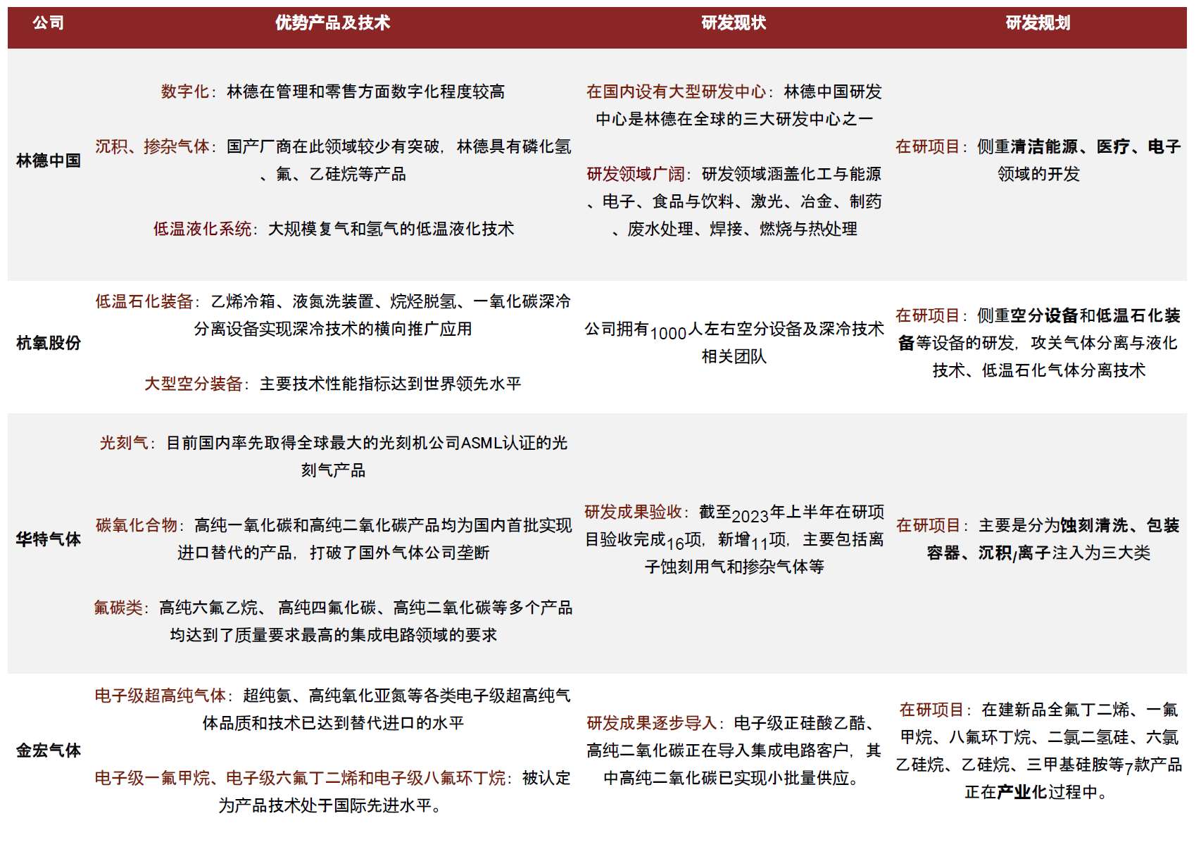 与国际巨头相比,国内工业气体企业在技术方面仍有一定差距,但均有各自的优势产品,未来产品开发也在持续布局: