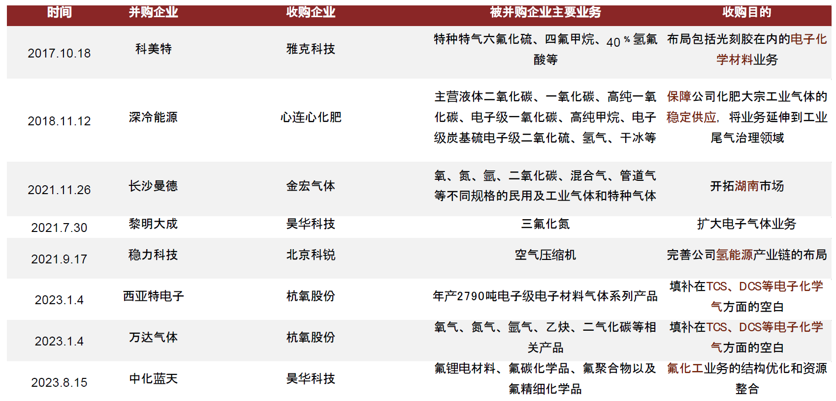 以电子特气为例:集成电路制造需使用上百种电子特种气体,客户存在多元化需求,促进企业并购。以晶圆制造过程中需要使用的电子特气种类为例,需要使用氟化铵和氟化氢等多元电子特气吹扫刻蚀晶圆基板,此外还需要铪烷/氧/氩/CF4/SF4等多种气体。客户对气体产品存在多元化需求,往往在某一终端产品的制造中所需气体种类达几十种以上。根据无锡华东气体有限公司披露,出于成本控制、仓储管理、供应稳定等多方考量,客户更愿意在一家气体公司采购,因此希望气体公司覆盖更多的气体种类。而特气种类繁多,单一品种销量较小,故特气企业常常通过并购的方式进行品类的扩张。