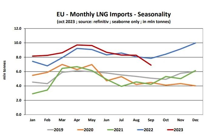 2023年前9个月,欧盟进口了7650万吨液化天然气,较去年同期增加了4.4%。欧盟27国占全球海运LNG进口量的25.3%,其次是中国的16.9%和日本的16.3%。今年前三季度,中国进口了5090万吨LNG,同比增长10.8%,低于2021年同期的5910万吨。