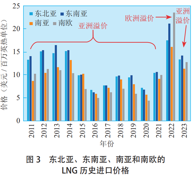 从溢价水平来看,2011—2023年东北亚比南欧平均溢价1.97美元/百万英热单位,东南亚比南欧平均溢价2.54美元/百万英热单位,东南亚比东北亚平均溢价0.57美元/百万英热单位,南亚比南欧平均溢价0.15美元/百万英热单位;单就 2022年来看,南欧比东北亚溢价6.02美元/百万英热单位,比东南亚溢价2.45美元/百万英热单位,比南亚溢价7.48美元/百万英热单位。