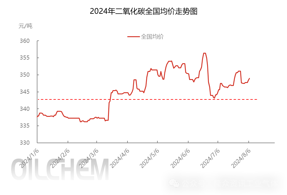 据隆众统计,截止8月6日,二氧化碳均价在349元/吨,环比(7月6日)上涨0.89%,同比-18.27%。数据显示,二氧化碳价格不及去年同期价格,主要受二氧化碳产能过剩影响,供需矛盾突出,价格难以回到同期价格。虽然往年二氧化碳市场有明显的淡旺季之分,但今年来看,二氧化碳淡旺季不明显。现阶段旺季不旺特点显著。图中可以看出市场震荡调整为主。