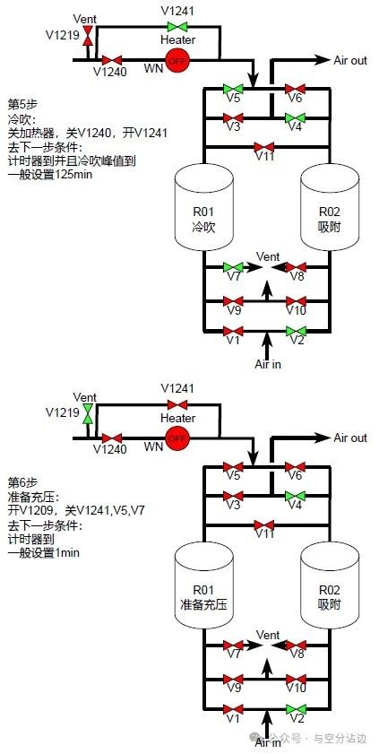 偏题了,讲回分子筛纯化系统的顺控程序发展,从林德学习资料内记录的8步(每个吸附器分四个过程:排气、加热、冷却、充气)到如今主流的18步(每个吸附器分九个过程:准备泄压、泄压、准备加热、加热、冷吹、准备充压、充压、准备切换、切换),几十年间经历了什么?再插一句题外话,空分设计人员在翻阅GB16912(俗称氧规)时,反复会提到的一句话就是,这本规范里每一条都是血淋淋的经验和教训,所以必须要带着崇敬的心态来尊重规范里的所有内容。当然,对于分子筛纯化系统的顺控程序的发展没有这么沉重,但是每一步进化和每一处优化,无不饱含着操作中发生的问题和前辈的智慧。我们先从8步的开始说起吧。