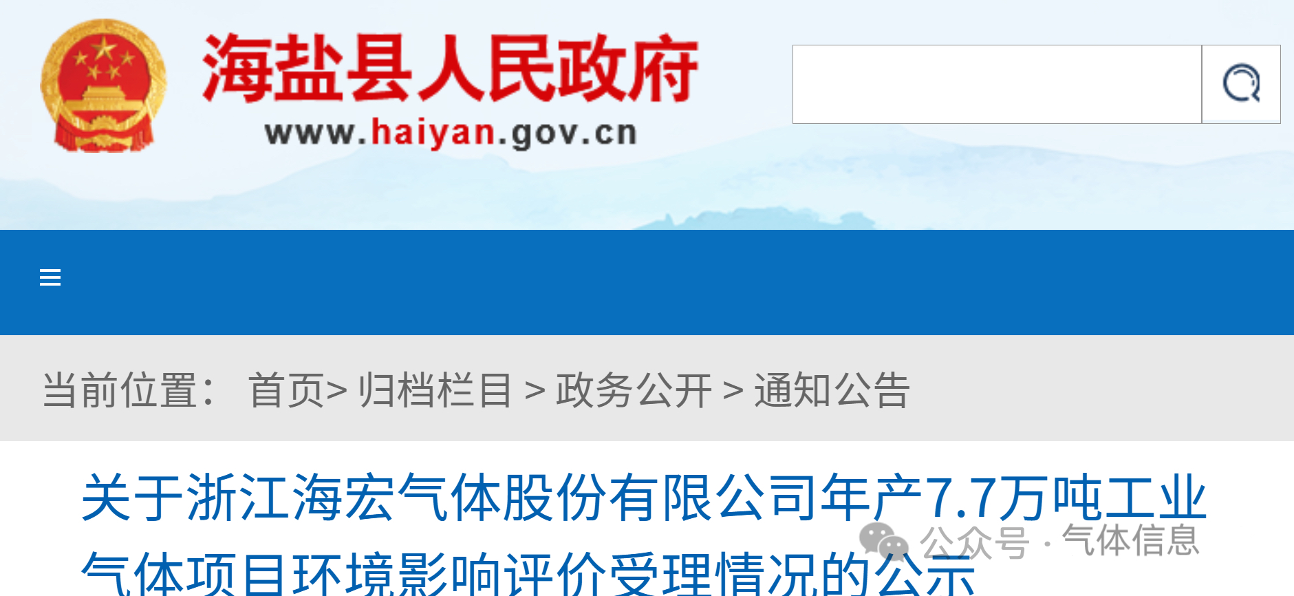 10月10日,浙江海宏气体股份有限公司年产7.7万吨工业气体项目环境影响评价受理公示。