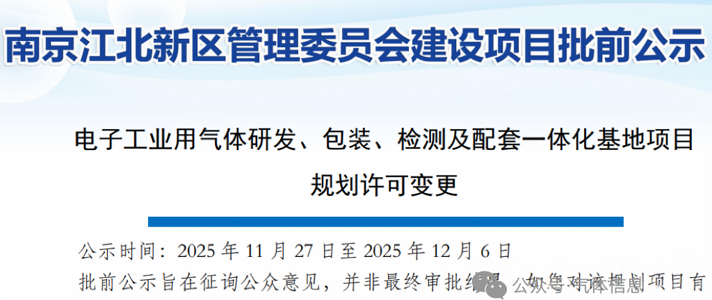 11月27日,南京江北新区管委会官网发布电子工业用气体研发、包装、检测及配套一体化基地项目规划许可变更批前公示。