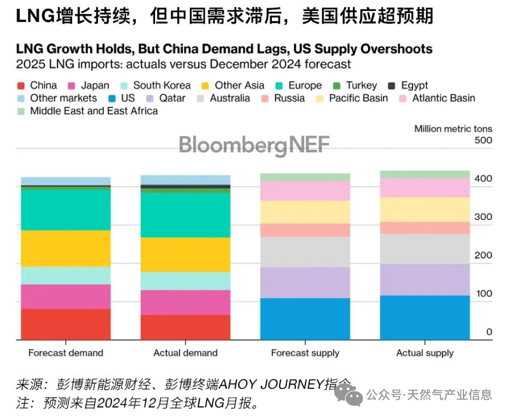 2025年全球LNG需求达到4.3亿吨,较2024年增长6%。中国LNG进口量下降14%,较彭博新能源财经在2024年12月的预测低19%。