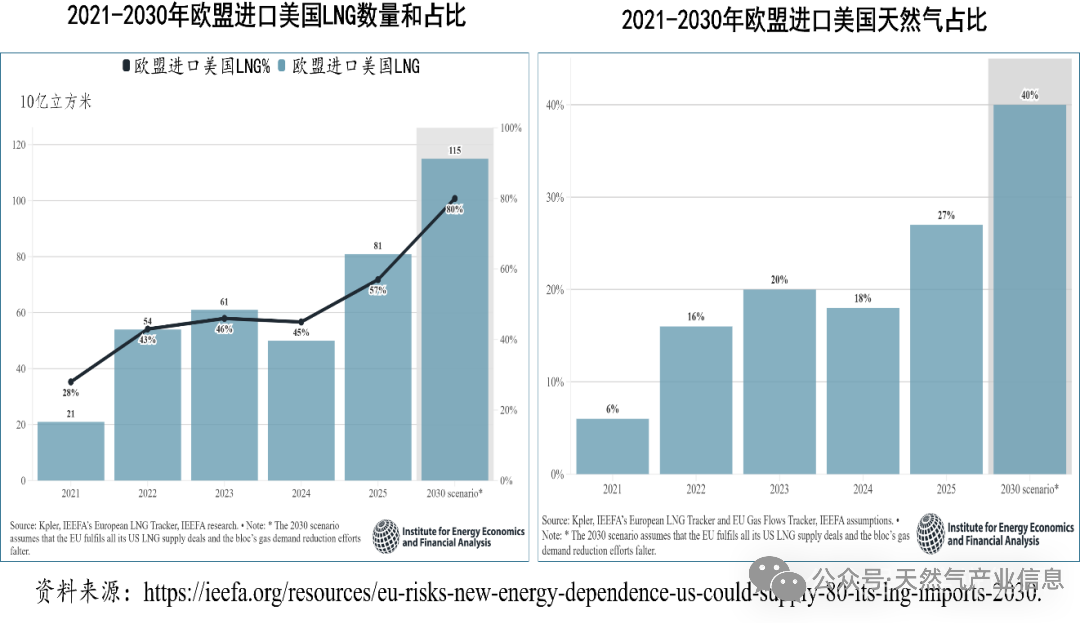如果所有这些交易得以实现,设在美国俄亥俄州山谷城的能源经济和金融分析研究所(Institute for Energy Economics and Financial Analysis,IEEFA)预计,2030年,欧盟从美国进口的液化天然气将增加到约1150亿立方米,这意味着欧盟75%至80%的液化天然气进口将来自美国。2025年,欧盟进口的天然气和液化天然气总量中,美国占比为27%。在2030年的情景下,新的液化天然气合同预计将使这一比例在2030年升至40%。