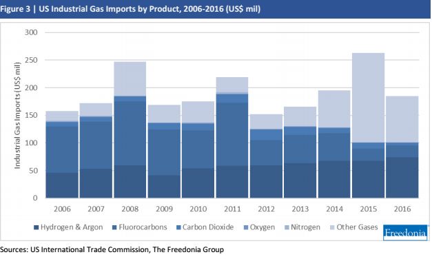 图3 | 按产品划分的美国工业气体进口额,2006-2016(美元)