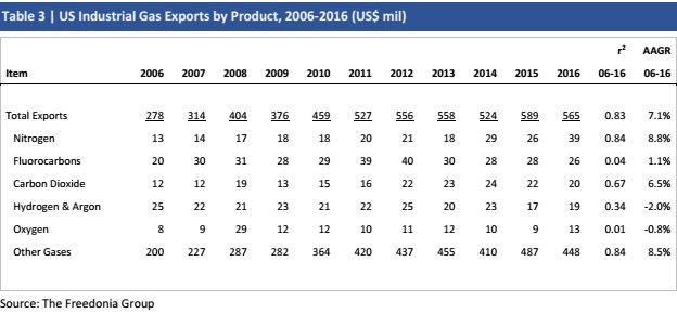 表3 | 美国2006 - 2016年工业气体产品出口(美元)