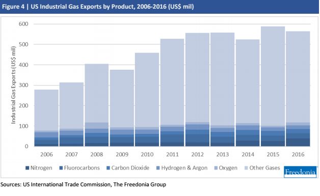 2016年美国工业气体净出口额为3.8亿美元。当年,进口占需求的3.0%,而出口占国内出口的8.7%。