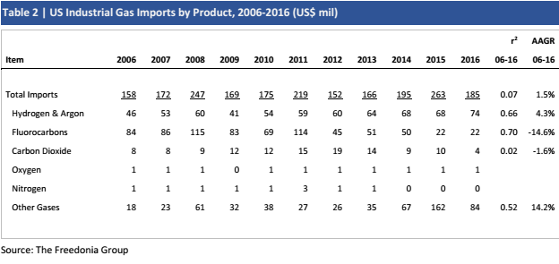 表2 | 按产品划分的美国工业气体进口额,2006-2016(美元)